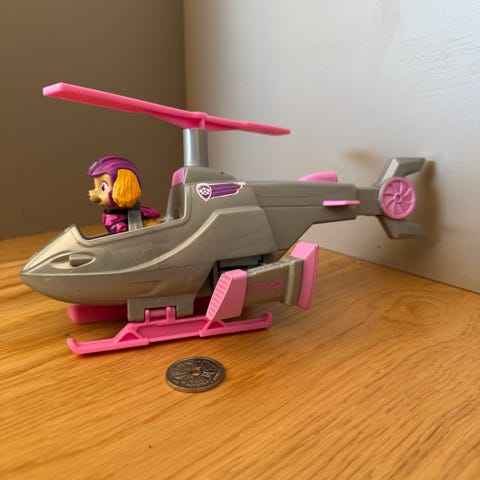 Paw Patrol Skye helikopter legetøjsfigur. Figuren forestiller Skye placeret i sin karakteristiske helikopter med grå krop og lyserøde detaljer. Egnet som legetøj til børn, der kender Paw Patrol-universet, eller som supplement til andre Paw Patrol-figurer og køretøjer.