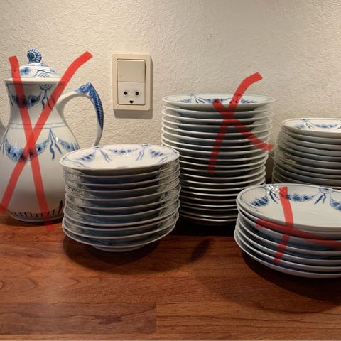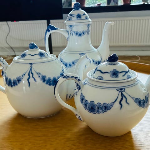 3 komplette sæt med kopper, underkopper og kagetallerkener + 1 ekstra kagetallerken.
