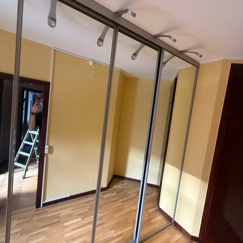 Garderobe skab med skydedøre i rigtig god stand. Alt indmad medfølger. Skal selv bæres ned fra 4 sal.