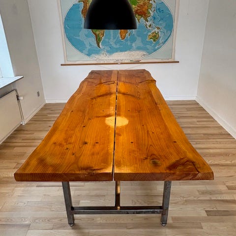 Hjemmelavet plankebord i libanesisk cedertræ, samt 7 stole i mahogni fra Søborg møbelfabrik sælges. Der er plads til 10 personer omkring bordet, Bordet måler 90*255cm. Er lavet af mig selv, er tømrer/snedker.