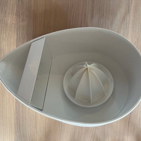 KitchenAid citruspresser i hvid plast. Består af skål med tud, aftagelig kegle til presning samt indsats med si til at tilbageholde kerner og frugtkød. Monteres på en KitchenAid køkkenmaskine via aksel i bunden. Velegnet til presning af citrusfrugter som appelsiner, citroner og lime direkte ned i skål eller kande.