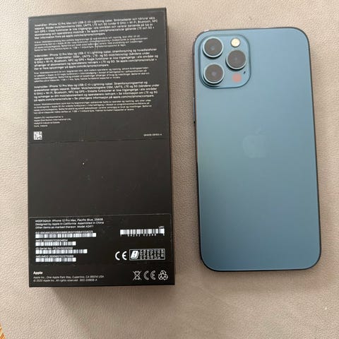 Apple iPhone 12 Pro Max smartphone med 256 GB intern hukommelse. Modellen har stor skærm, tredobbelt kamera på bagsiden og frontkamera i skærmens øverste kant. Enheden på billederne fremstår i blå farve. Telefonen leveres med original æske som vist på billedet. Der medfølger desuden et gennemsigtigt cover med MagSafe-ring, som kan bruges til magnetisk fastgørelse af kompatibelt tilbehør. Velegnet til almindelig daglig brug, foto, video og apps med behov for større lagerplads.