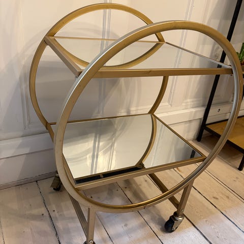 Drinksbord på hjul i guldfarvet metal og glasplader