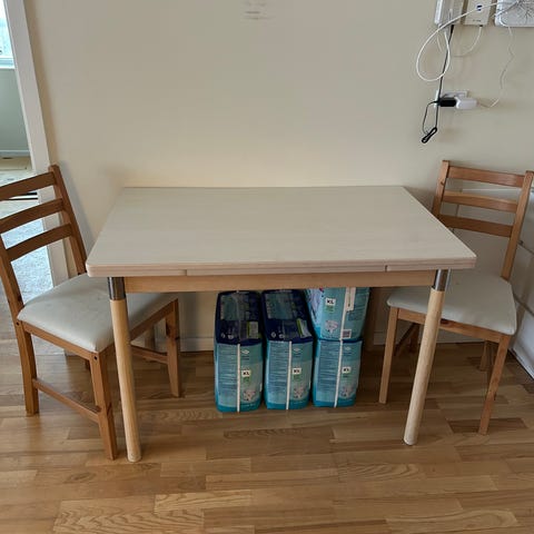 Bortgives solidt spisebord med 6 stole