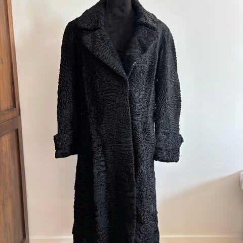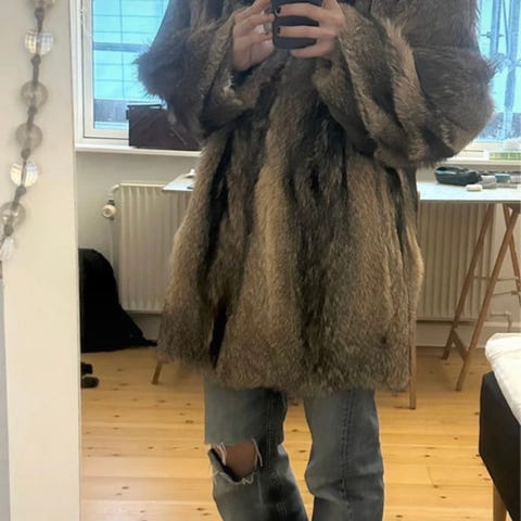 Silkenfor inden i frakken er intakt, frakken kan renses. Sjov lille skindtaske næsten samme farve følger gratis med.