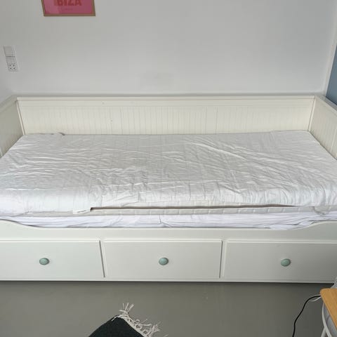 IKEA seng med skuffer i hvid. Sengen har ryg- og sidegavle, så den kan bruges både som seng og som daybed/sofa. Under sengen er 3 skuffer.