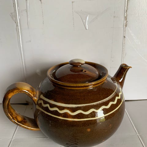 Tekande i stentøj fra ukendt keramiker. Kanden har rillet overflade og er glaseret i beige med mørk brun bund og låg. Klassisk form med hank og tud samt lille holder til teske ved tuden. Undersiden har indridset signatur. Velegnet til servering af te eller som dekorativt indslag i køkken eller stue.