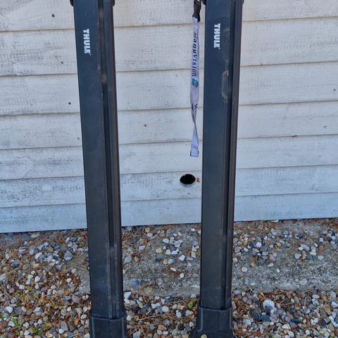 Thule tagbøjler, kun brugt en enkelt gang, og så har de ligget og samlet lidt støv. Der mangler en lille plastik klik-dims.