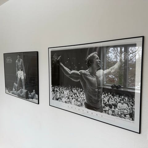 Indrammet (sort metal) fotoplakat med ikonisk boksekamp fra 1965 Mohammad Ali versus Sonny Liston. Monteret i glas og sort ramme. Rammen har tynd profil og hænges på væg. Velegnet som vægdekoration i træningsrum. Glasset er gået lidt i stykker i øverste venstre hjørne.