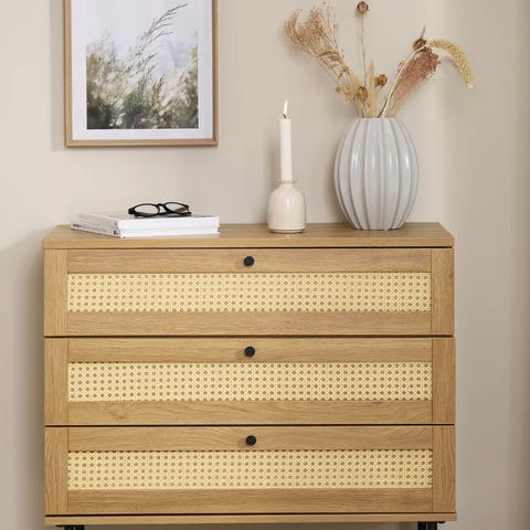kommode i trælook. Kommoden har flere skuffer med metalgreb og en overflade i mørkt trælook. Velegnet til opbevaring i soveværelse, stue eller entré. Designet er enkelt med klassiske fronter og rektangulære greb.
