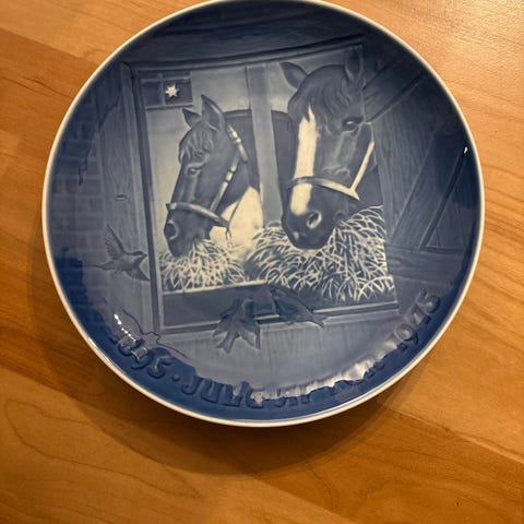 Bing & Grøndahl juleplatte i porcelæn med blå-hvid dekoration. Motivet viser et vinterlandskab med gård, træ og sne, samt årstal og dato nederst på pladen. Bagsiden har Bing & Grøndahl stempel og ophængningshuller, så pladen kan bruges som vægdekoration. Velegnet som samlerobjekt eller som del af julepynt i hjemmet.