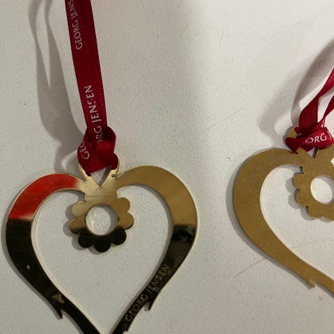 Georg Jensen juleophæng formet som et flettet hjerte i guldfarvet metal. Ophænget har en lang stang med hjerte nederst og spiralformet ophæng øverst. Velegnet som klassisk juledekoration til ophæng på juletræ, grene eller andre steder i hjemmet i december.