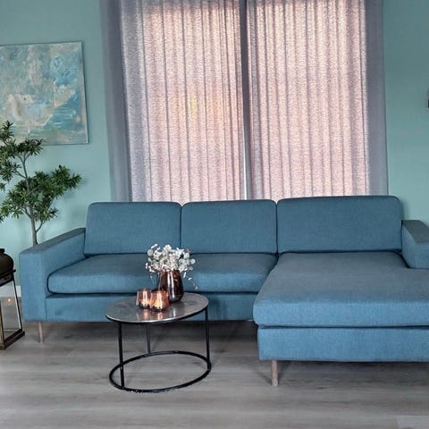 Smukkeste blå grå chaiselong i slidstærkt og rengøringsvenligt stof. Stof på hynder og puder kan aftages og vaskes i maskine.