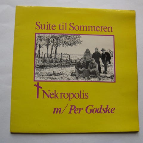 Nekropolis m/ Per Godske lp med titlen "Suite til Sommeren". Albummet indeholder numre fordelt på side I og side II, blandt andet "Tidlig søndag morgen", "Hvorfor i alverden elsker du mig?", "Den første sne (og, mens du kan)", "Vintermorgensfarvel" og "Tider vender". Omslaget er i gul og blå farve med fotografier og dansk tekst på for- og bagside. Velegnet til samlere af dansk musik på lp.SJælden dansk lp fra 1976 coveret i flot stand.lp har overfladisk snavs på sang 1 side a. Ikke forsøgt fjernet.minus noteshæfte.