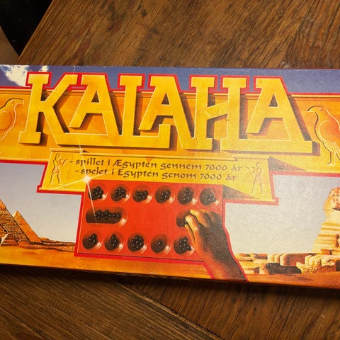 Træ Kalaha brætspil med farvede glaskugler. Spillet består af et bræt i træ med fordybninger til kuglerne og to større skåle i hver ende. Medfølgende kugler i flere farver. Egnet som strategispil for to spillere fra ca. 6 år og opefter. Velegnet til familiebrug og som introduktion til brætspil med simple regler og taktiske muligheder.
