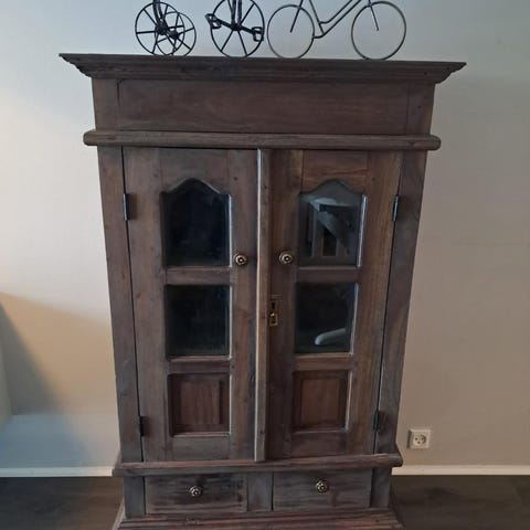Blåt vitrineskab med over- og underskab træ