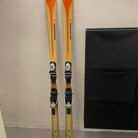 Dynastar alpinski med bindinger i grøn og sort. Skiene har integrerede justerbare bindinger monteret og er velegnede til alpint skiløb på pister. Brugt gennem flere sæsoner indtil ejer ønskede at "opgradere". En super-ski som med en enkel slibning kan tjene dig i mange år