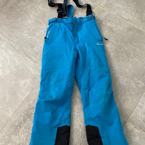 2117 skibukser i str. 152. Bukserne er orange med sorte detaljer og har seler. De har lynlåslomme på benet og lynlåsåbning ved benafslutningen. Velegnede som skibukser eller vinterbukser til børn i ca. str. 152.