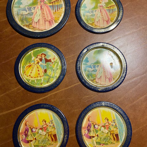 7 stk coaster/glasbrikker med original æske. Design Philipp efter udnævnelse til det kongelige svenske hof siden 1834. Diameter 8 cm.