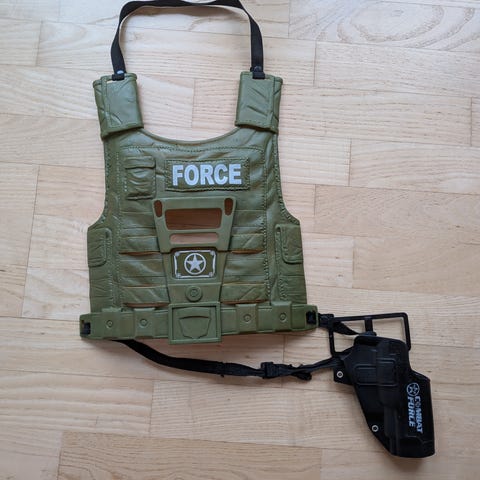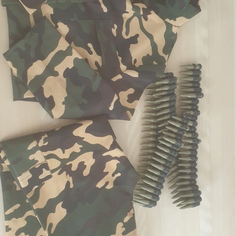 Militær/soldater kostume. Kun brugt til fastelavn, derfor i god stand. Inklusiv bælte og “pandebånd”.
