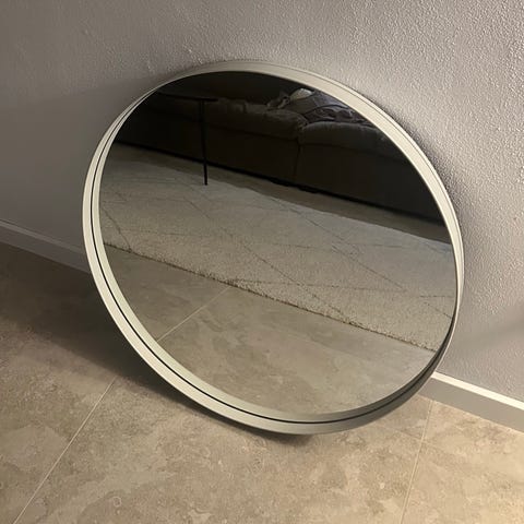 Hay rundt spejl med hvid ramme. Spejlet har en enkel, moderne udformning og kan anvendes i for eksempel entré, soveværelse eller stue. Velegnet til ophængning på væg eller opstilling efter behov, afhængigt af beslag og placering.
