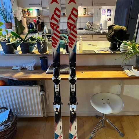 Super topski fra Atomic. Skiene har nogle år på bagen, men har kun kørt 7 uger. De er pæne og velholdt. Har kun kørt på dem i 2 dage efter seneste slibning. Sålen fremstår dermed pæn. De har nogle brugsspor og ridser på oversiden, som følge af liftkøer, men der er ikke noget der påvirker skiene når du kører.