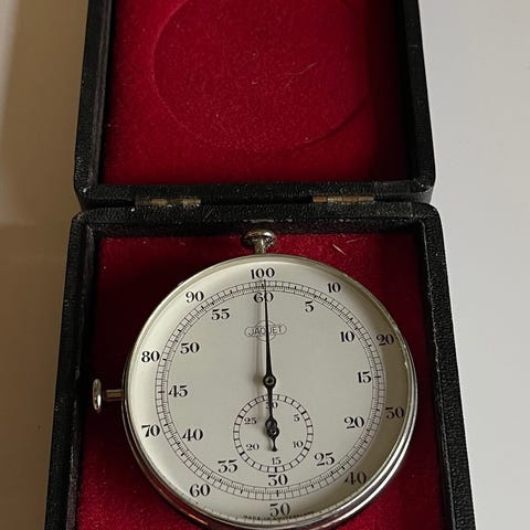 Stopur. JAQUET. Uret er i stål og måler 49 mm. Samler inskription på bagsiden. Det går fint og fungerer korrekt.