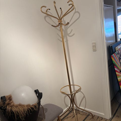 VINTAGE Stumtjener fra 50erne i messing med dekorative detaljer og trebenet fod. Egnet til ophæng af overtøj, hatte og tilbehør i entré eller garderobe. Fritstående model i metal med klassisk udformning.Mangler en lang knage foroven ellers fin stand Højde 176, Dia 46 ( SENDER IKKE)
