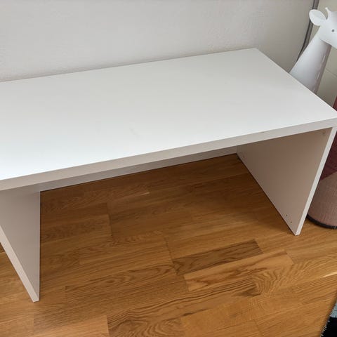 IKEA STUVA børnebord med opbevaring i hvid. Bordet har en rektangulær bordplade og en integreret opbevaringskasse under pladen, som kan trækkes ud. Overfladen er glat og velegnet til leg, tegning eller lektier. Bordet er udført i hvidt plademateriale. Der ses mindre brugsspor på overfladen og indersiden af kassen. Egnet til brug på børneværelse eller legeområde, hvor der er behov for både bordplads og opbevaring.