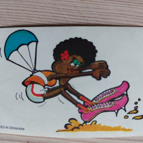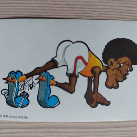 Samlemærker fra 70'erne, men humoristiske sportsmotiver.