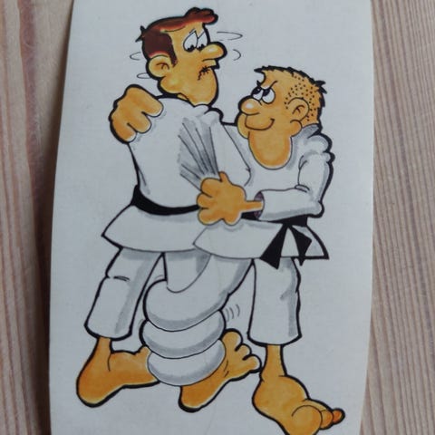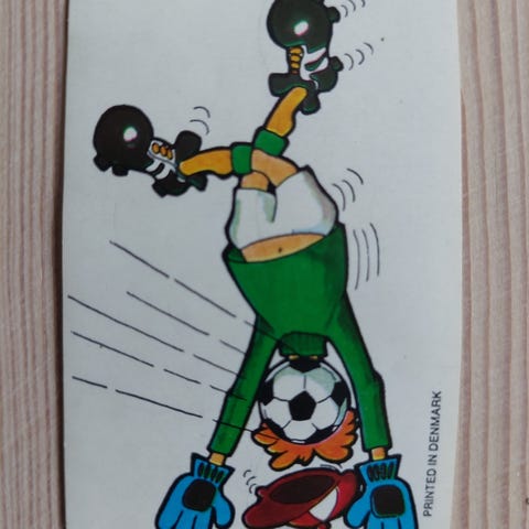 Samlemærker fra 70'erne, men humoristiske sportsmotiver.