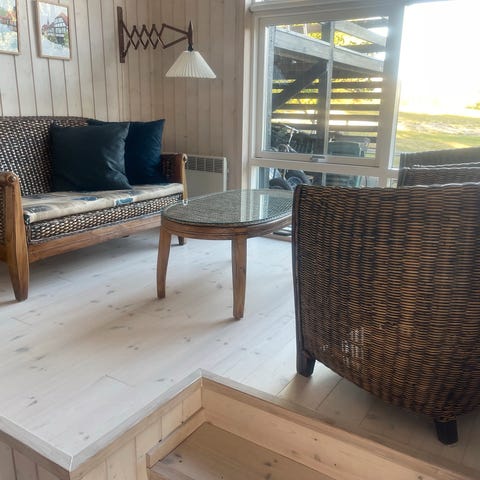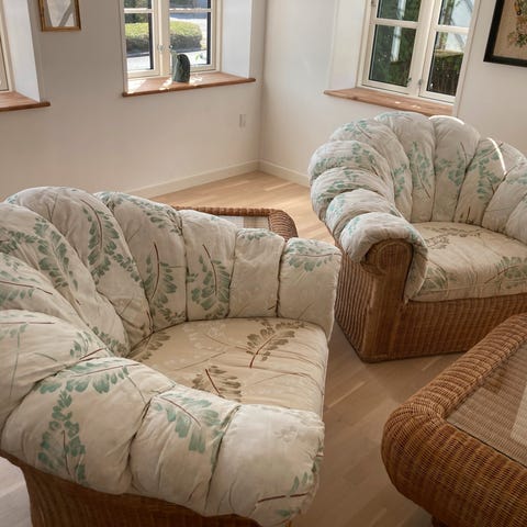 Hele sættet skal sælges, da huset skal tømmes. Bord, 4 stole, sofa, sofabord og sofastole samt reol og skammel. Alt i samme mærke og har altid stået inde. Står som nyt.