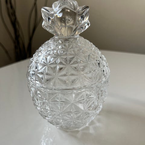 Sælges: En smuk, klassisk bonbonnière i transparent glas med et elegant, skåret mønster.