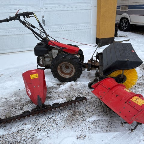 BCS 740 fejemaskine med frontmonteret 1 meter kost. BCS er søster maskiner til Ferrari maskinerne, som er produceret af BCS, så det er en solid arbejdshest med selvstarter og arbejdslys. Der er monteret nyt batteri på maskinen, samt nyt kabel til frem og bak.