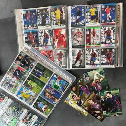 Panini fodboldkort samling med spillere fra Danmarks landshold. Kortene er opbevaret i plastlommer i mappe, og der ses flere forskellige udgaver og årgange, herunder enkelte special- eller glimmerkort. Velegnet til samlere af Panini fodboldkort og danske landsholdsspillere.