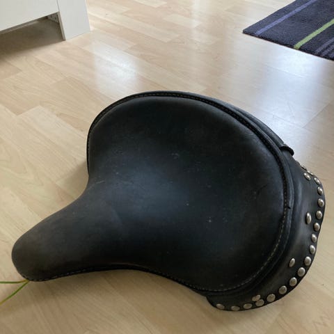 Sæde der har siddet på en Harly Davidson som bagsæde, men virker ikke optimalt, da det er et førersæde. Original fra Los Angeles.