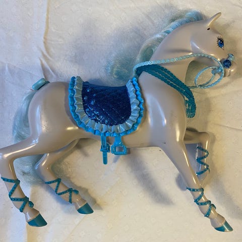 Stor barbiehest, som Elsa’s ‘vand-hest’ fra Frost 2. Med lys og lyd-effekt. OBS større end vanlige Barbie-heste. Nypris 999kr