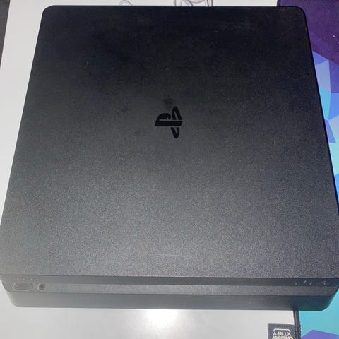Sony Playstation 4 Slim konsol i hvid. Konsollen er vist sammen med tre DualShock 4 controllere i forskellige farver samt et tilhørende USB‑kabel til opladning/forbindelse af controllerne. PS4 Slim er velegnet til spil, streaming og underholdning og kan tilsluttes tv via HDMI (kabel ikke vist på billederne). Oplagringskapacitet og øvrige specifikationer fremgår ikke af oplysningerne og bør kontrolleres separat, hvis det er relevant.
