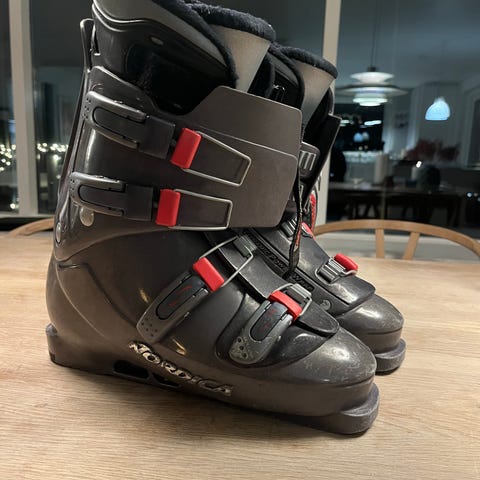 Størrelse 39. Nordica Dobermann skistøvler i hvidt plast med justerbare spænder i metal. Modellen har fire mikrojusterbare spænder og powerstrap øverst for bedre støtte om underbenet. Inderstøvlen er polstret for komfort og varme. Skistøvlerne er velegnede til alpint skiløb og giver god støtte til fod og ankel. Egner sig til brug med almindelige alpinski-bindinger, der passer til standard alpinstøvler.