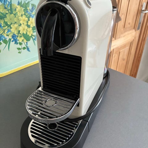 Nespresso kapsel kaffemaskine i sort. Maskinen er beregnet til brug med Nespresso-kapsler og brygger en enkelt kop ad gangen. Fronten har kopbakke og plads til en kop eller et glas. Velegnet til brygning af espresso og andre kaffedrikke baseret på kapsler. Designet til køkkenbrug på bordplade med tilslutning til almindelig stikkontakt.