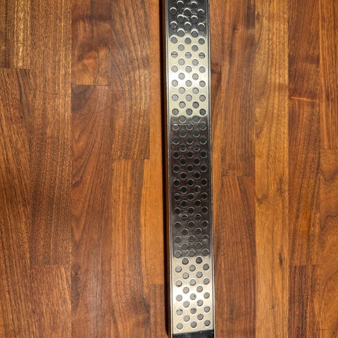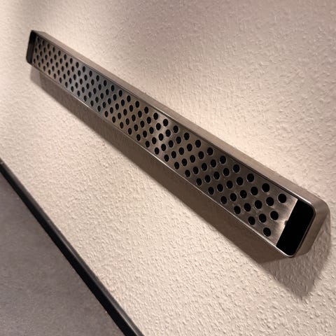 Global knivmagnet i metal. Magnetlisten har perforeret front med runde huller og er udført i metal med Global-logo på siden. Egnet til ophæng af køkkenknive og andet metalredskab på væg i køkkenet. Leveres med beslag og skruer til montering, som vist på billederne. 41 cm.