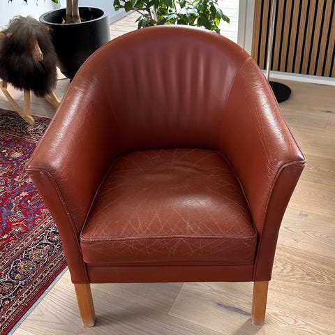 Mogens Hansen har tegnet Dronningestolen også kaldet MH80. Lænestolen har polstring i lyst læder og ben i lyst træ. Formen er afrundet med lav ryg og integrerede armlæn. Egnet som enkeltstående lænestol eller som del af en siddegruppe i stue, kontor eller loungeområde.