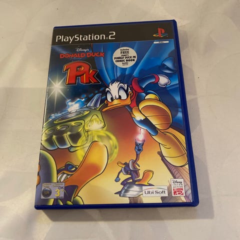 PlayStation 2 Disney Donald Duck PK spil. Action- og eventyrspil til PlayStation 2 med figuren Anders And i hovedrollen. Spillet er klassificeret til aldersgruppen 3+ ifølge PEGI-mærkning. Leveres på standard PlayStation 2-disk og kan spilles på kompatible PlayStation 2-konsoller.