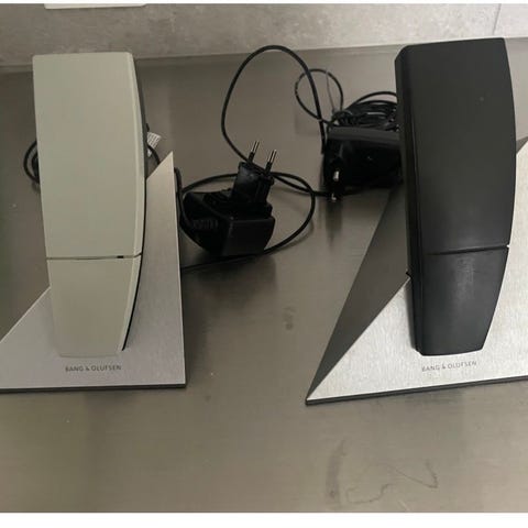 Bang & Olufsen BeoCom trådløs telefon med tilhørende basestation og ekstra enheder. Sættet består af håndsæt og trekantet ladestation/basestation i sølv og mørk front. Designet er vinklet og kompakt, egnet til placering på bord. Velegnet som fastnettelefonløsning i hjem eller kontor, hvor der ønskes en trådløs telefon med separat basestation.