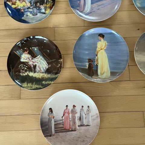 Bing & Grøndahl dekorationsplatter med malerimotiver af P. S. Krøyer. Platterne er udført i porcelæn med flerfarvet dekoration og er egnede som vægpynt eller dekoration i hjemmet.