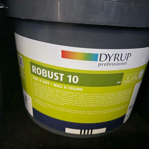 Dyrup Robust 05 væg- og loftmaling er en akrylmaling til indendørs brug på vægge og lofter. Produktet er beregnet til at give en robust og vaskbar overflade. Malingen er hvid og egner sig til rum, hvor der ønskes en mat til halvmat finish. Spanden indeholder 9 liter.