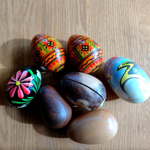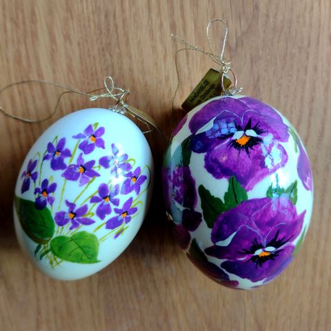 Smukkeste 5 raku ler æg, samt to store gåse æg der er farvet med løgskaller.