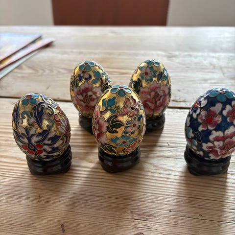 Æggene ligger i en gammel patineret messing skål/opsats.