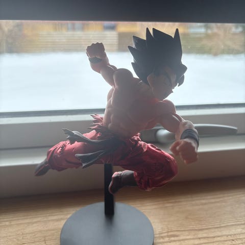 Dragon Ball actionfigur i hård plastik med blå hår og blå bukser. Figuren står i fast position med armene krydset og støttes af en lille blå fod. Egnet som legetøj eller som samlerfigur til hylde eller skrivebord. Ca. mellemstor figur, velegnet til indendørs brug.
