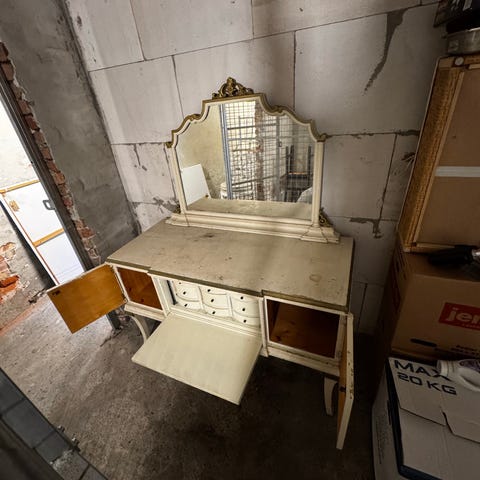 Smuk vintage sminkebord med spejl og stol cremefarvet træ